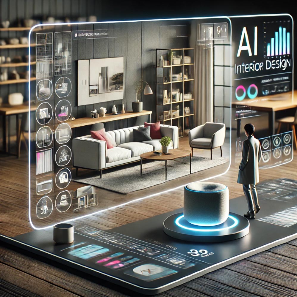 Đây là hình ảnh minh họa về giao diện kỹ thuật số tương lai của một công cụ thiết kế nội thất sử dụng AI như DecorMatters. Hình ảnh thể hiện một giao diện hiện đại, trực quan với nhiều lựa chọn về nội thất, bố cục phòng và bảng màu, giúp người dùng dễ dàng tạo ra không gian sống theo ý muốn.