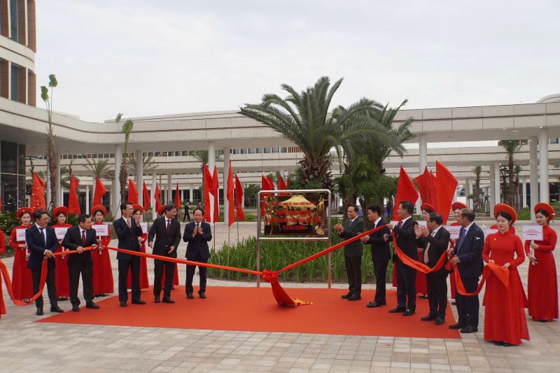 Các đồng chí lãnh đạo Trung ương và thành phố thực hiện nghi thức gắn biển Trung tâm Chính trị - Hành chính Bắc sông Cấm