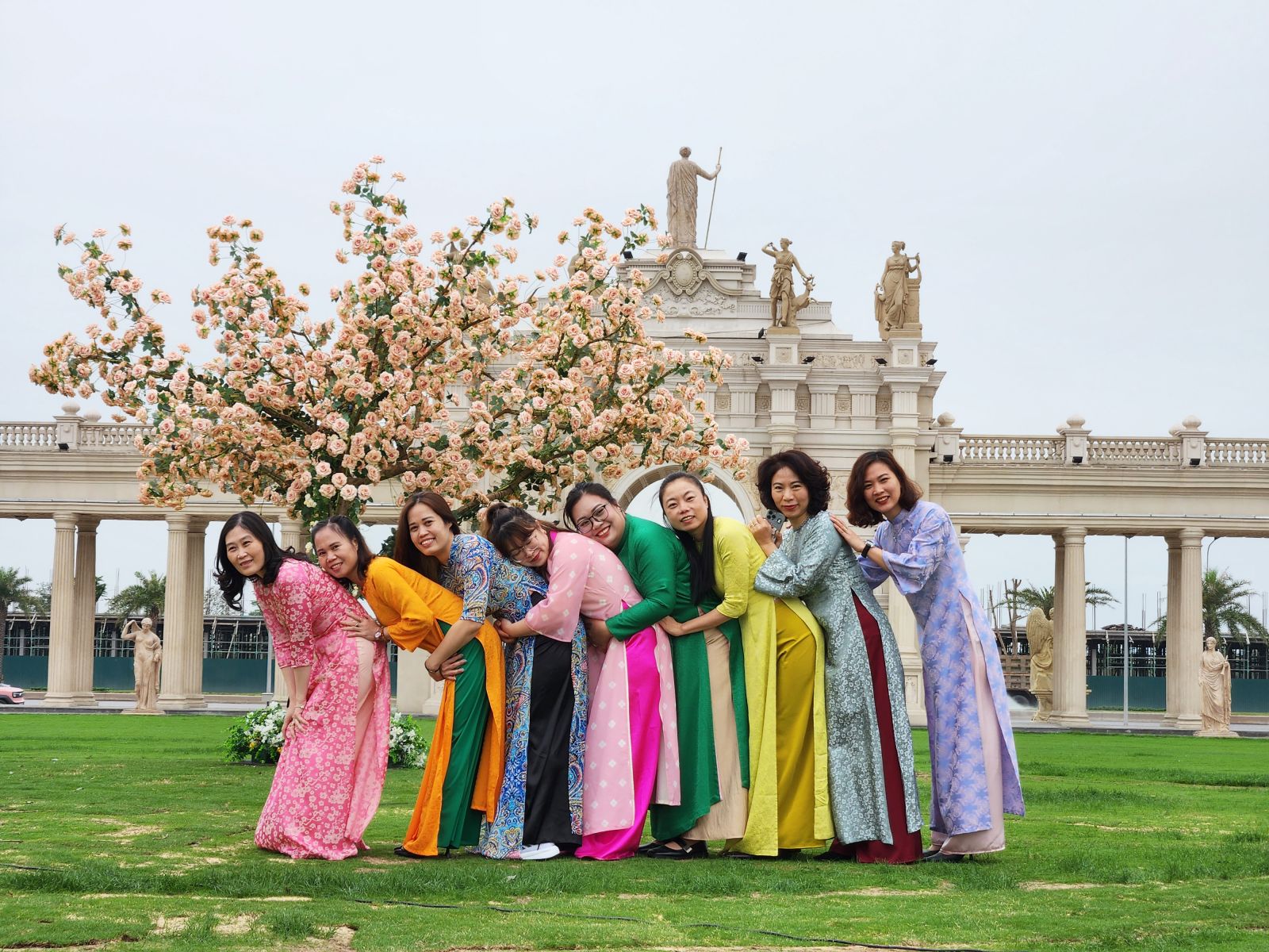 Tập thể chị em chụp ảnh lưu niệm trước cổng công ty