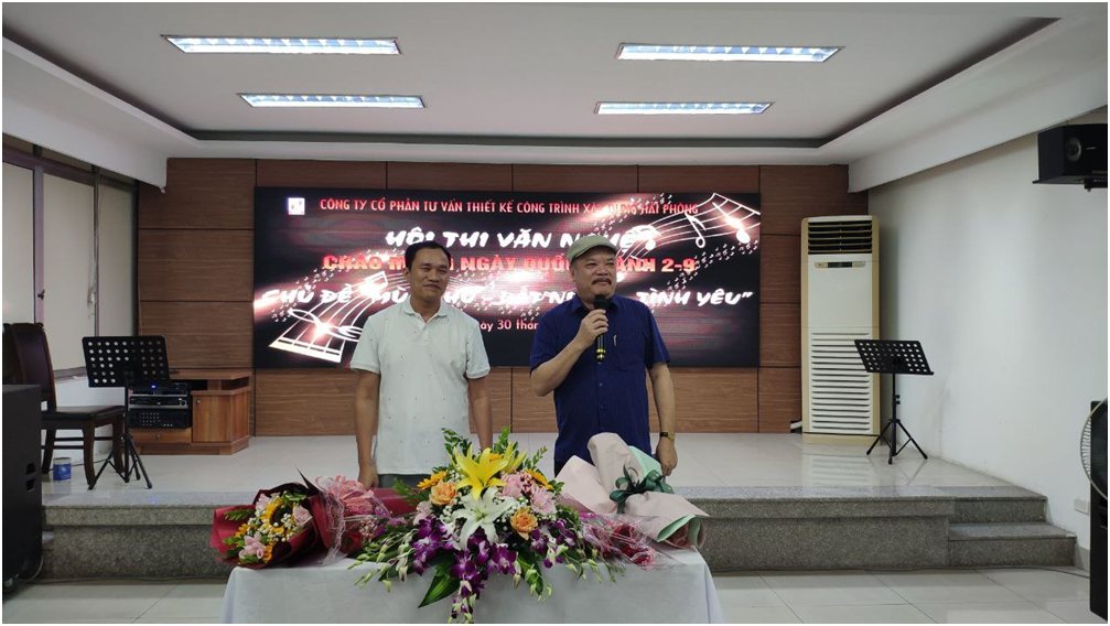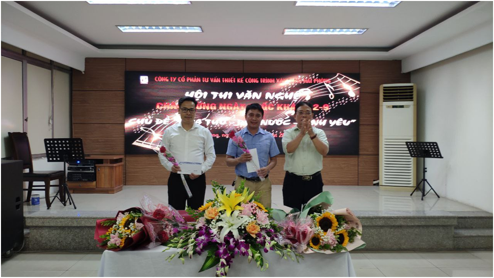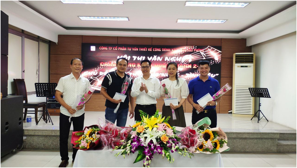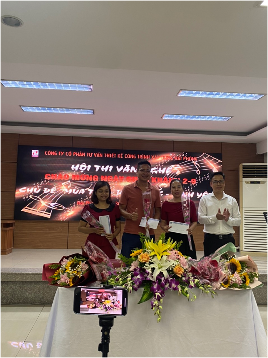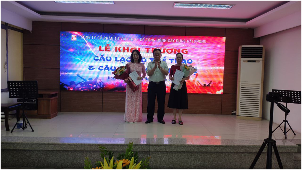 Tổng giám đốc Trần Quang Dũng trao Quyết định và tặng hoa cho Chủ nhiệm Câu lạc bộ Thể thao là chị Phùng Bích Thủy (Phó Chánh văn phòng, ngoài cùng bên trái) và Chủ nhiệm Câu lạc bộ Văn nghệ là ông Nguyễn Hữu Hiệp (Phó Tổng giám đốc)